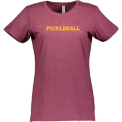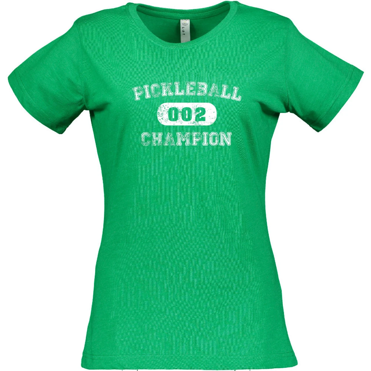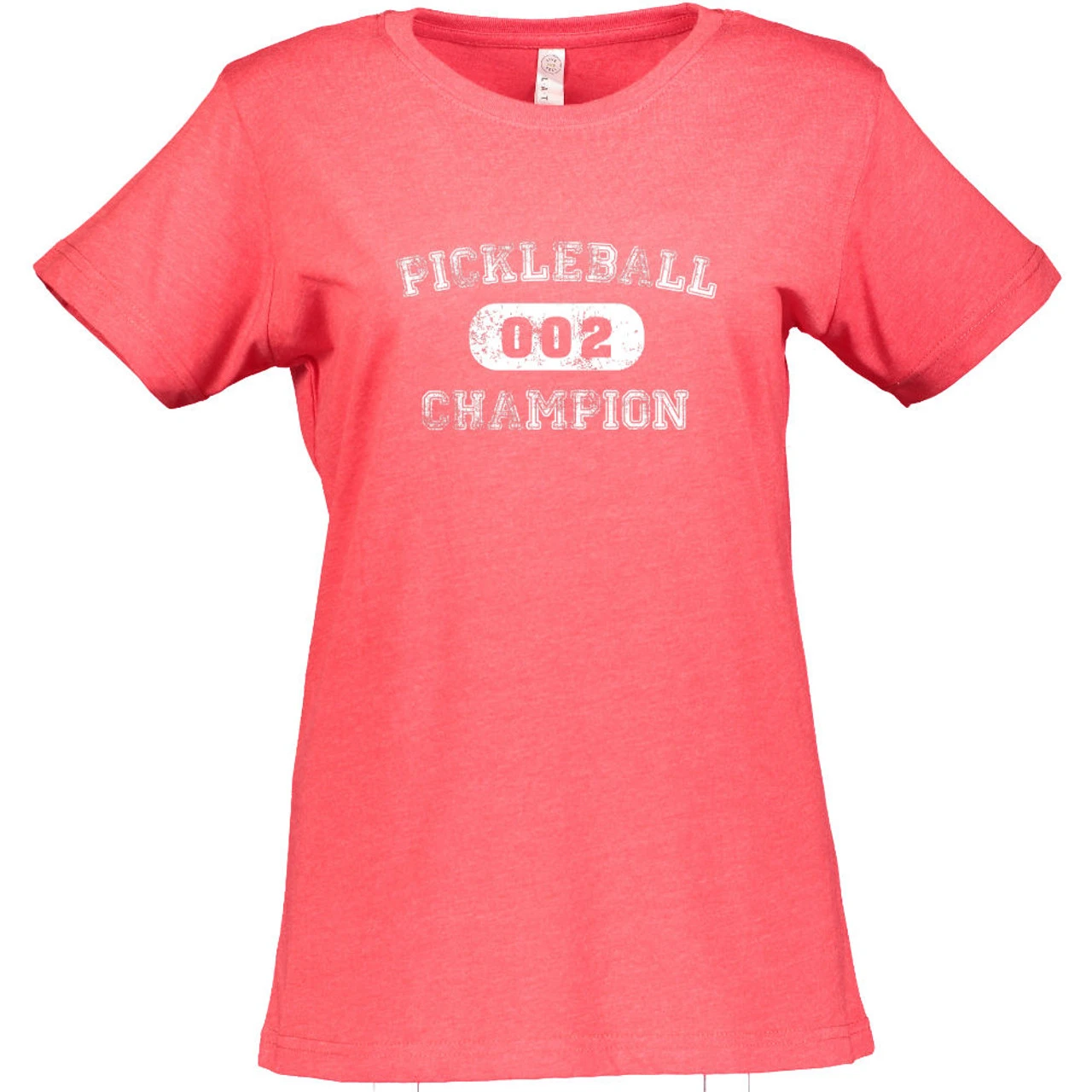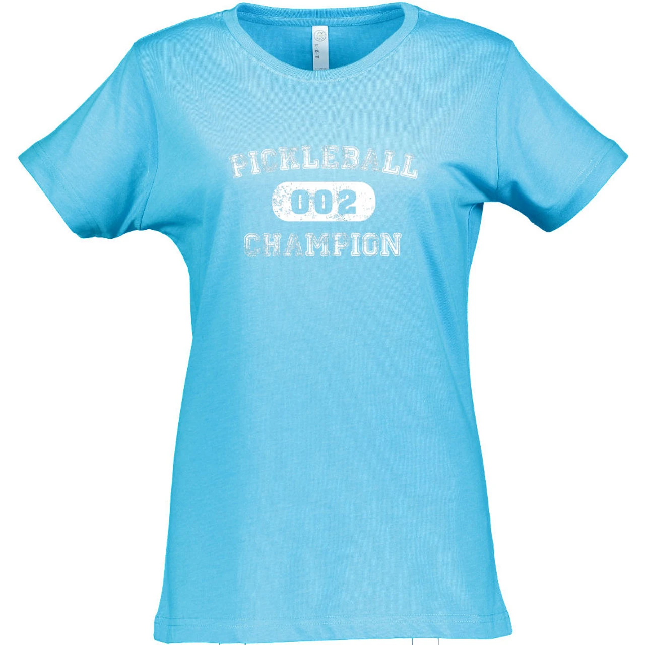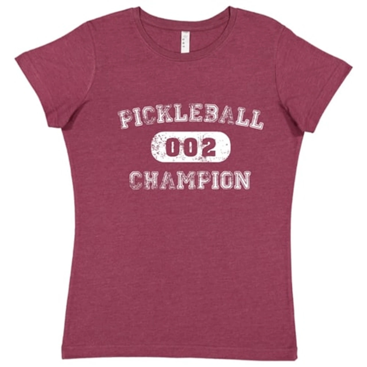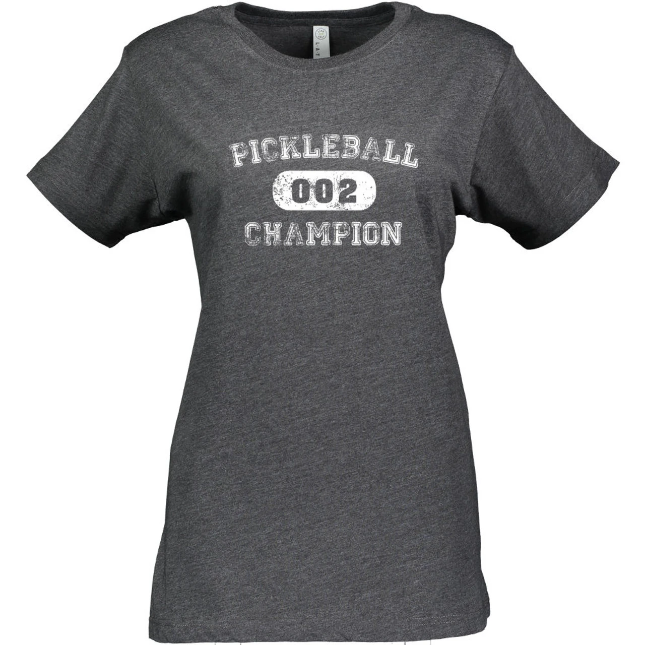 This design calls to mind a classic sports jersey with its weathered wording and numbering. The phrase reads “Pickleball Champion” in a bold white font and has “002” placed in the center as a nod to pickleball’s starting score. The full image is 10 by 6 inches and is located in the center of the shirt. The short-sleeve shirt is 4.5oz cotton/poly blend (90/10 in Vintage Heather; 60/40 in all other colors) fine jersey knit with a topstitched ribbed collar. The style is semi-fitted with double-needle sleeves and bottom hem.
