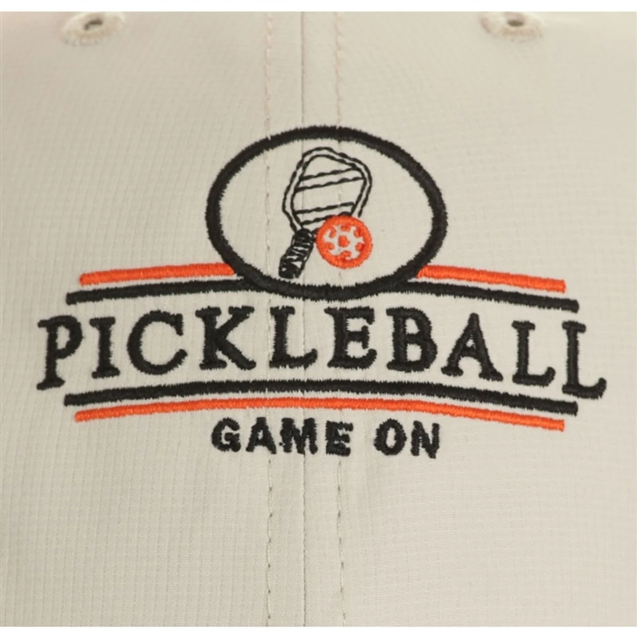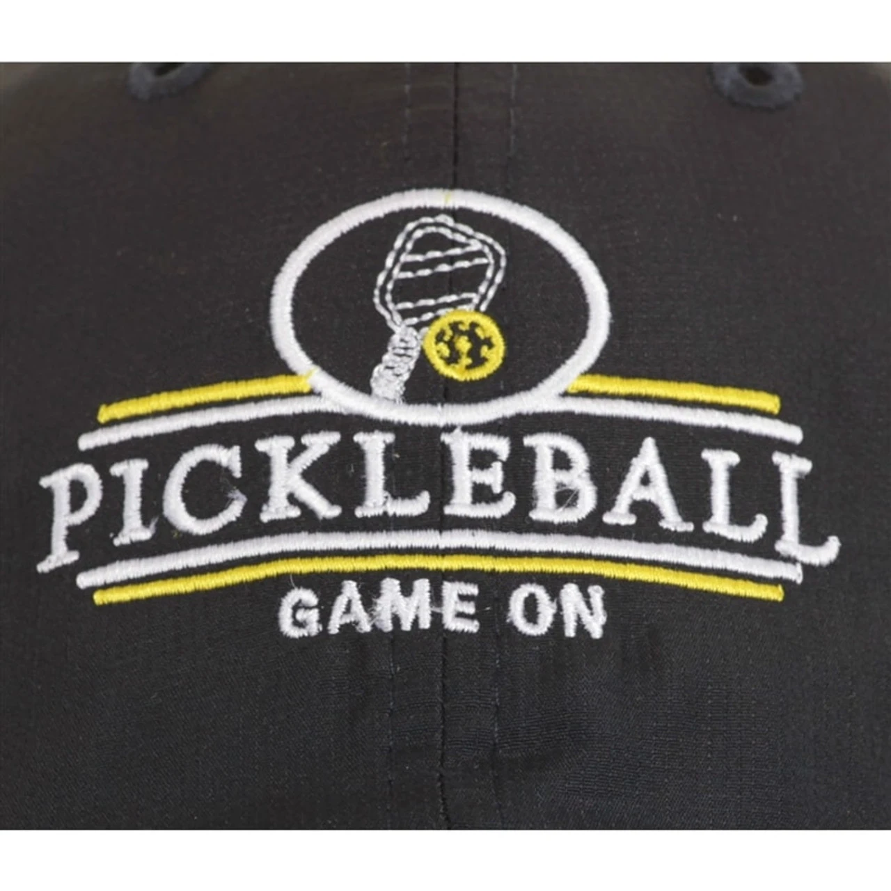 The Performance Cap features the word “PICKLEBALL” in large, classic lettering with the phrase “GAME ON” just underneath in a contrasting color to the hat. Above this text is the graphic of a pickleball paddle and pickleball. The lightweight and breathable fabric makes this hat perfect for all-day wear. The brim is great for keeping the sun out of your eyes so you have crystal clear sightlines for playing pickleball.