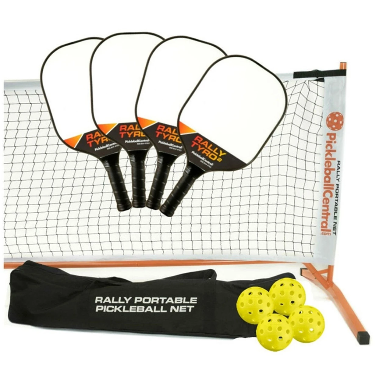 The Rally Tyro 2 Set will get you serving and rallying with the best of them before you know it! This well-rounded set provides you with our sturdy Rally Portable Net System, four light weight Rally Tyro 2 Paddles and four outdoor balls. It’s a great buy for new players looking to accommodate people of all sizes.
