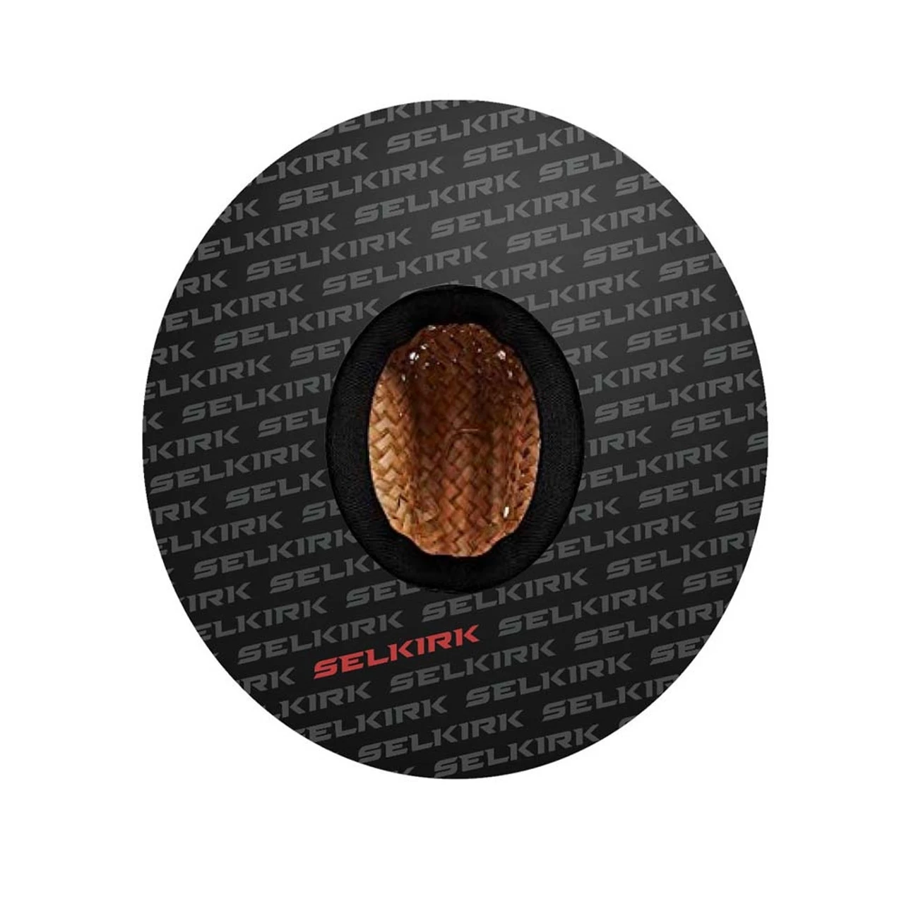 The Straw Hat has a natural color with a red Selkirk logo placed in the center of the design. An adjustable drawstring chin strap and sweatband help keep it in place if the weather starts to get windy. Underneath the brim is a fun surprise—a pattern consisting of the Selkirk name in grey and red on top of a black background.