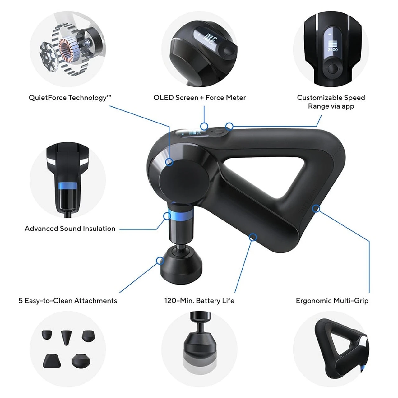 The Theragun Elite Smart Percussive Massager has a 2-hour usage time and runs on a rechargeable lithium-ion battery. It features a helpful OLED screen which displays the current speed and a responsive force meter. It arrives with 5 attachments which target different areas of the body: the Standard Ball for most muscle groups, Dampener for tender areas, Thumb for trigger points, Wedge for the IT band and shoulder blades, and Cone for pinpoint treatment. Each attachment is made from closed-cell foam which can be quickly cleaned to maintain hygiene. The Elite can be connected to Therabody’s app, allowing you to store routines, use treatment presets, and discover new recommendations based on your usage. One year warranty included.