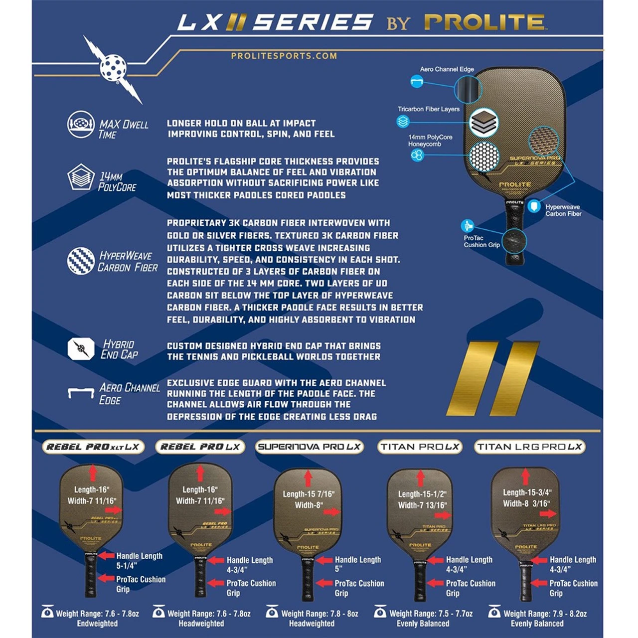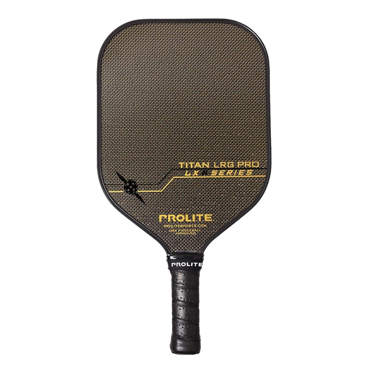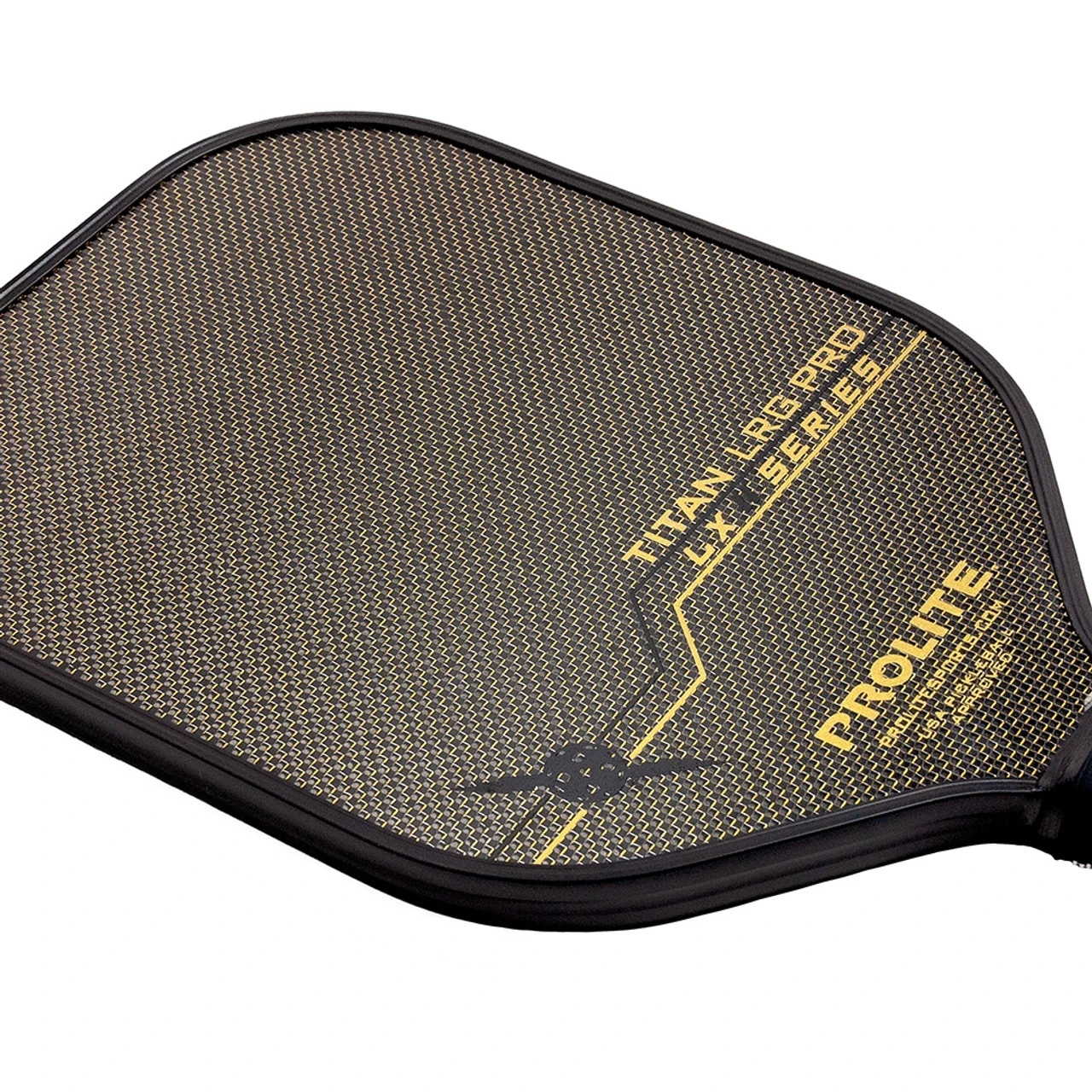 The Titan LRG Pro Hyperweave LX Pickleball Paddle (Large Titan) is a shape familiar to PROLITE fans, and represents the widest model in the next-gen “Hyperweave” series. A leap forward in paddle technology from the most established name in pickleball, PROLITE’s latest approach to materials engineering incorporates three layers of carbon fiber on each side. The top layer shimmers, thanks to a tight cross-weave of gold or silver (your choice) fibers interwoven with the carbon fibers. The result is a pickleball paddle that looks every bit as good as it performs on the court. The mixed-material and multi-layered final product is a paddle face so stiff you really can consider the sweet spot to be nearly the entirety of the hittable surface area, bringing a lingering, more intentional feel to every strike. These premium materials truly do yield premium performance.