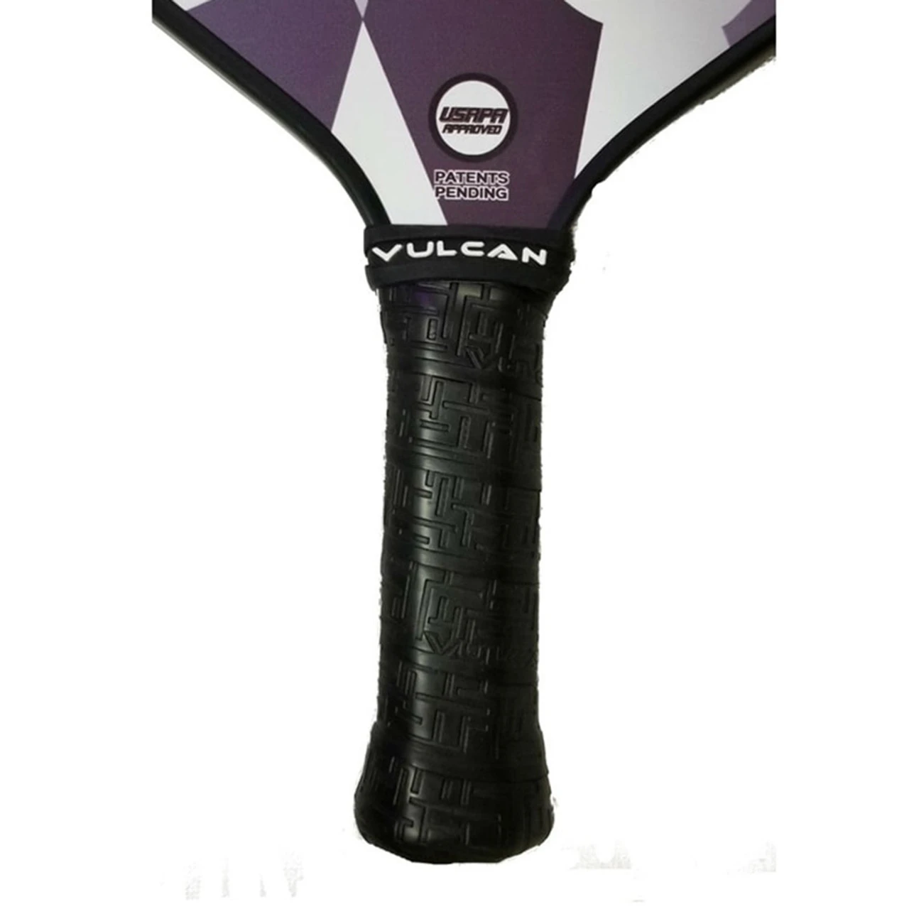 The Vulcan V510 Hybrid Pickleball Paddle has a 4-3/4″ long handle and weighs an average of 7.9 oz. The carbon fiber surface is 7-3/4″ wide and helps give you the great ball feel that graphite and carbon fiber paddles are known for. Geometric shapes overlay a white background for a clean and minimal design. Vulcan’s name is printed vertically along the left side of the face with the paddle name in the lower right.