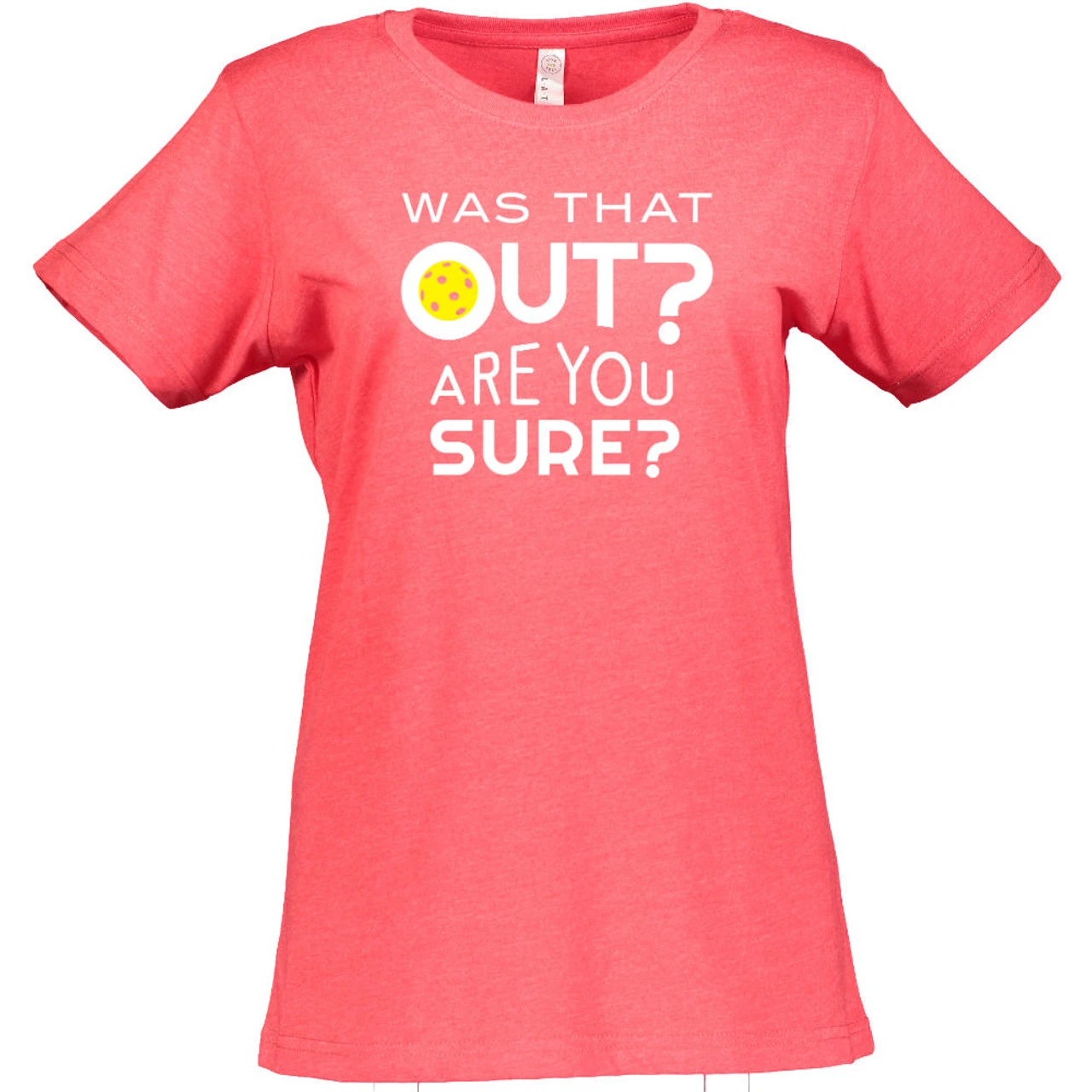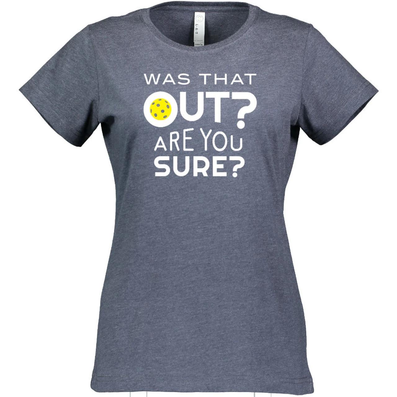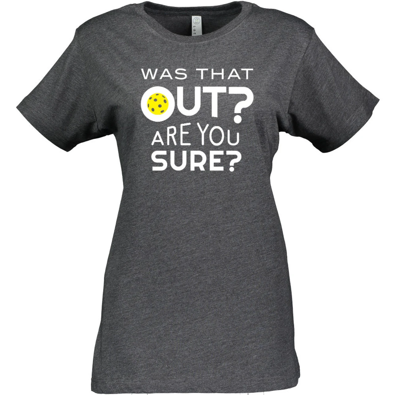 The Women’s Was That Out Shirt might help you get other players to think twice about their calls—or it may bring some smiles to their faces! The cheeky design asks, “Was that out? Are you sure?” and has a yellow pickleball decorating the middle of the “o” in “out.” The design is centered on the shirt in white and measures 9 x 8. The short-sleeve shirt is 4.5oz cotton/poly blend (90/10 in Vintage Heather; 60/40 in all other colors) fine jersey knit with a topstitched ribbed collar. The style is semi-fitted with double-needle sleeves and bottom hem.