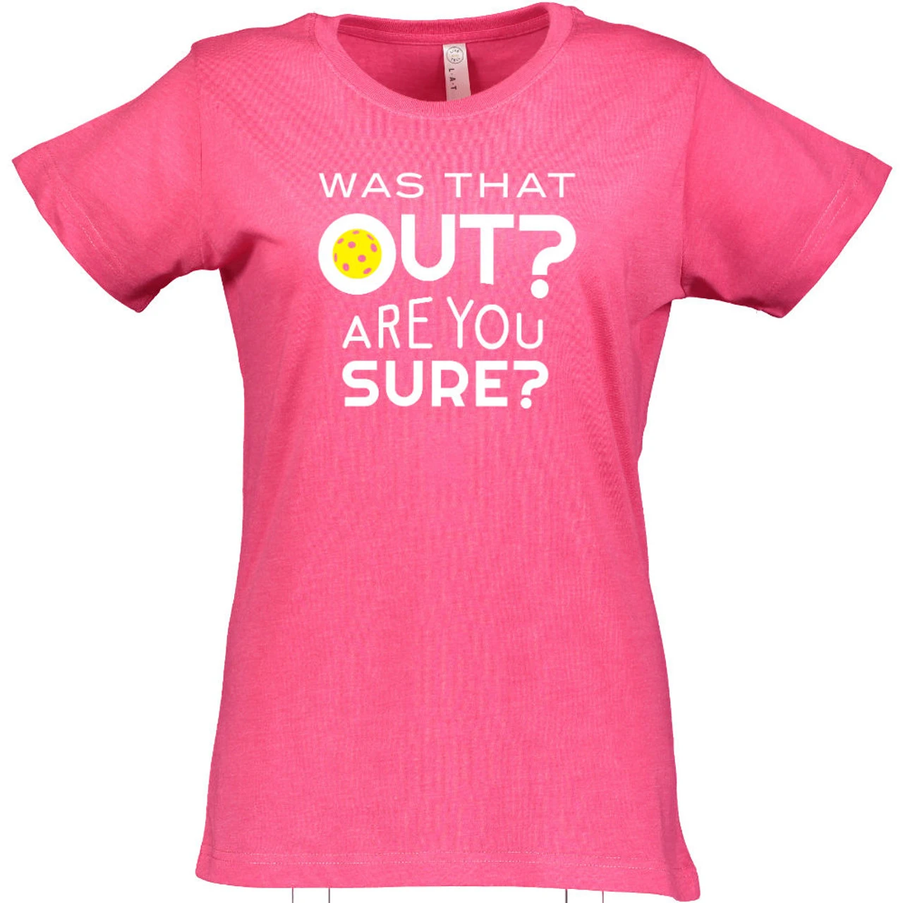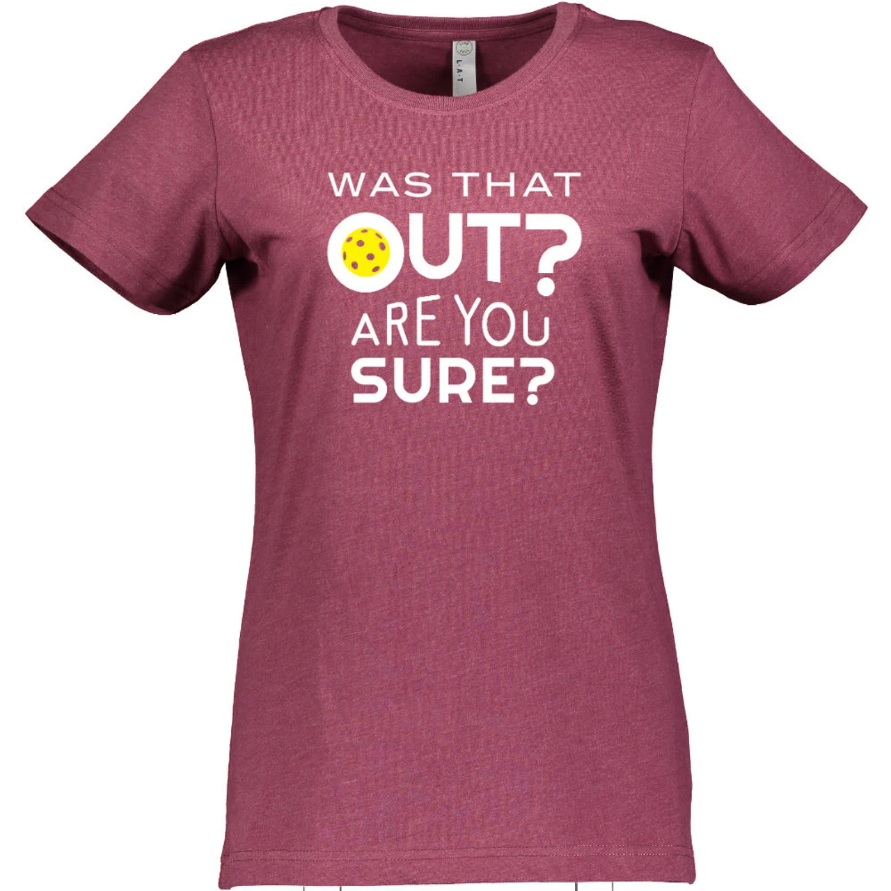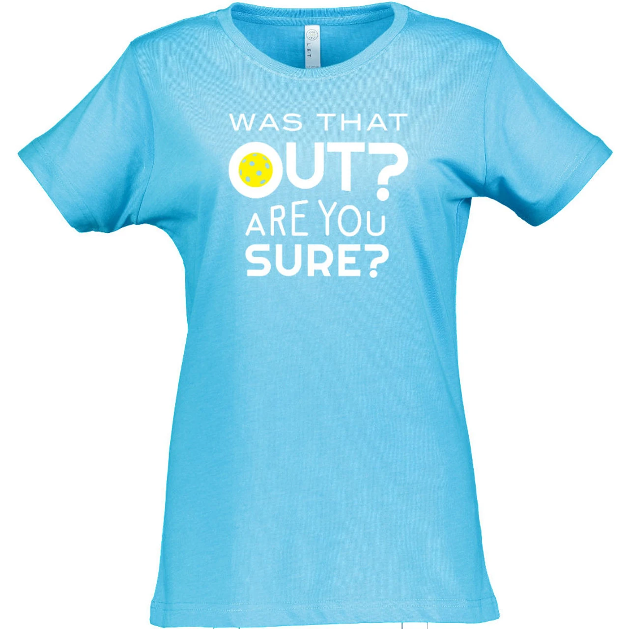 The Women’s Was That Out Shirt might help you get other players to think twice about their calls—or it may bring some smiles to their faces! The cheeky design asks, “Was that out? Are you sure?” and has a yellow pickleball decorating the middle of the “o” in “out.” The design is centered on the shirt in white and measures 9 x 8. The short-sleeve shirt is 4.5oz cotton/poly blend (90/10 in Vintage Heather; 60/40 in all other colors) fine jersey knit with a topstitched ribbed collar. The style is semi-fitted with double-needle sleeves and bottom hem.